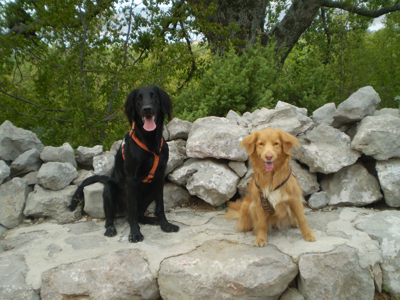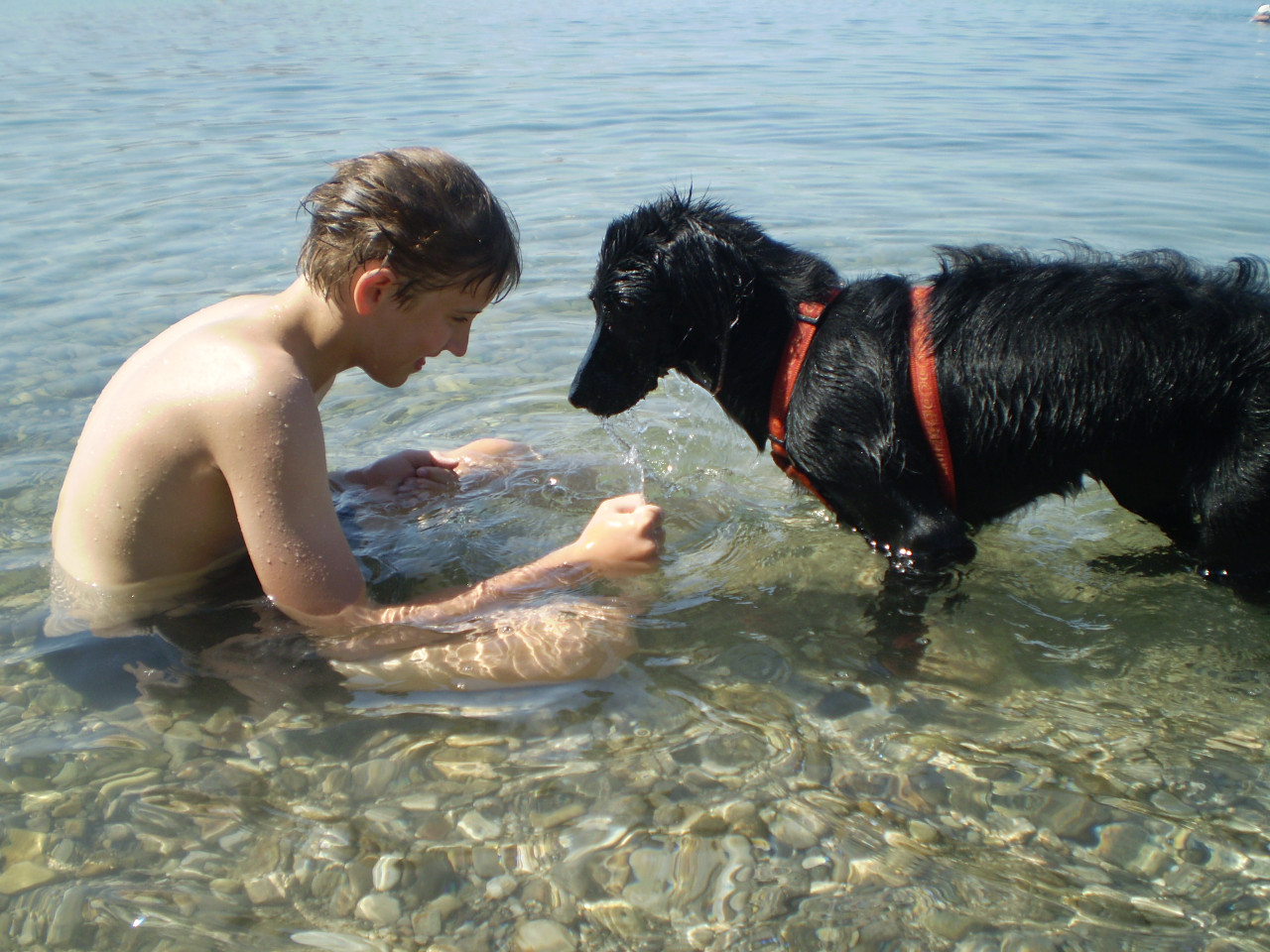 Doma jsme se dlouho neohřáli a 17. července jsme odjeli na dovču do Chorvatska. Bebinka je mazák, k móřu jela už po třetí a věděla, co ji čeká. Zato Simbína neměla ani páru :-) S cestou problém nebyl, holky jsou zvyklé jezdit autem a i když byla cesta tentokrát trochu delší, nedělalo jim to nejmenší problém. Ubytování bylo bez chybičky a pláže, moře a hory taky. Simbina reakce, když uviděla moře, byla lehce předvídatelná. Chytla amok a za každou cenu se tam snažila dostat a kdybychom ji násilím nevytáhli, zůstala by tam dodnes :-) První dva dny psychotila, protože všude kolem ní byla voda, spousta lidí házících do vody kamínky a do toho cizí prostředí... Potom byla tak unavená, že celé dopoledne strávila odpočinkem na pokoji a odpoledne začalo všechno na novo, akorát už se dala trochu ukočírovat :-) S mamkou jsme se shodly, že možná trpí nějakým syndromem hyperaktivního dítěte v psím podání, no těžko říct. Betynka si dovču užívala po svém, obvykle si 2x-3x denně zaplavala a potom střídala vyhřívání na sluníčku s ochlazováním ve stínu. Zato Simba strávila celou dobu, co byla na volno naložená ve vodě a číhala, jestli se někdo nesmiluje a nehodí jí klacek. Stejně jako minulé dva roky jsme i tento rok chodili po místních horách. Jenom na dva výlety jsme nemohli vzít pesany, protože se to prý na horách, které jsme přecházeli, hemžilo zmijemi (my jsme ale žádnou nepotkali). No dovča byla perfektní, snad nebyla poslední :-) Fotky